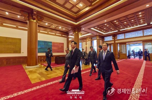 본격적인 일정에 앞서 이 대통령은 청와대 본관에서 아침 차담 회의를 주재하면서 참모들로부터 주요 현안과 업무 계획을 보고받았다.