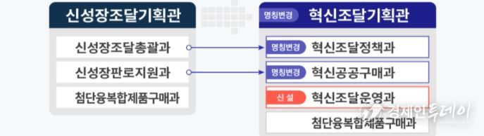 먼저, 기존의 신성장조달기획관을 「혁신조달기획관」으로 개편한다. 이는 막대한 공공구매력을 정책 수단으로 전략적 활용하여 혁신기업의 성장을 지원하는 ‘혁신조달’의 기능을 보다 명확히 하기 위해서다. 기존 소속 부서들의 명칭 또한 담당 업무를 좀 더 직관적으로 이해할 수 있도록 변경한다.