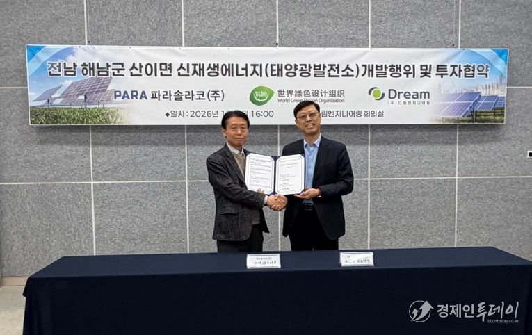 파라솔라코(주)(대표 고창열)와 (주)드림엔지니어링(대표 오진택)은 2026년 1월 6일 오후 4시, 드림엔지니어링 본사 회의실에서 ‘해남군 산이면 태양광발전소 개발허가 및 솔라시도 타운 조성 협약식’을 개최했다고 밝혔다.