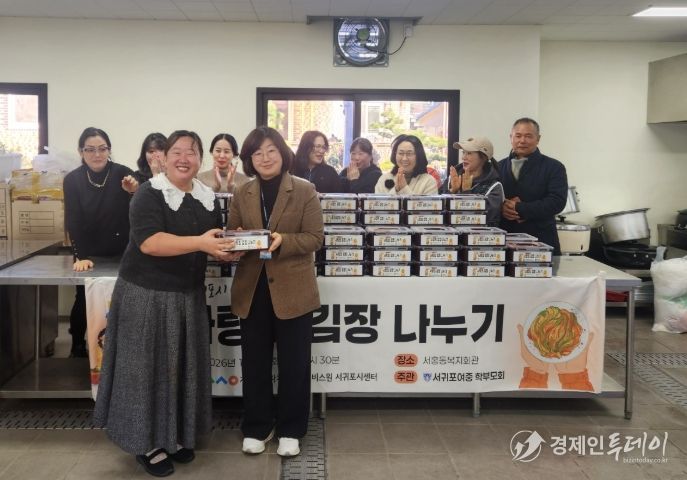 경제인투데이 류현민 기자 | 제주도교육청 서귀포여자중학교 학부모회는 6일 서호동복지회관에서 보호자와 교직원 15명이 참여한 가운데 ‘사랑의 김장 나눔’ 활동을 펼쳤다.