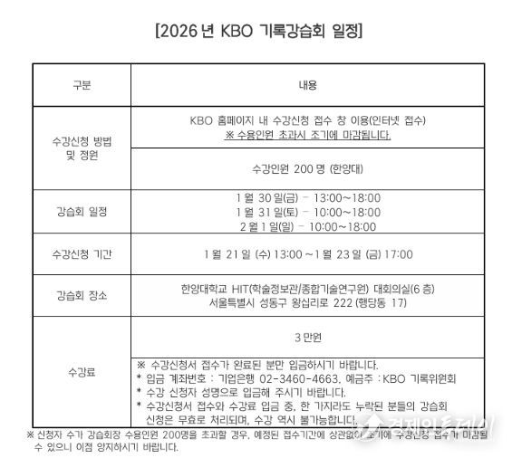 수강 신청은 1월 21일(수) 오후 1시부터 23일(금) 오후 5시까지 KBO 홈페이지 수강신청 접수 창을 통해 가능하며, 기타 문의사항은 KBO 홈페이지 내 기록위원회 스코어링 필드 1:1 문의하기를 이용하면 된다.