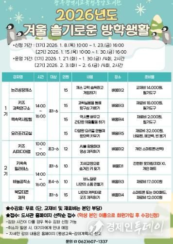경제인투데이 류현민 기자 | 광주시교육청중앙도서관은 겨울방학을 맞아 오는 27일부터 2월 6일까지 초등학생을 대상으로 ‘겨울 슬기로운 방학생활’을 운영한다.