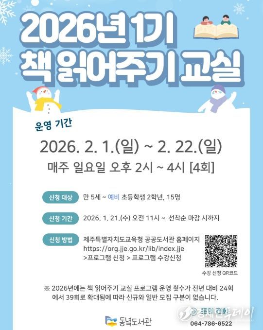 경제인투데이 류현민 기자 | 제주도교육청 동녘도서관은 2월 1일부터 22일까지 평생교육실에서 유아 및 저학년 어린이의 독서 흥미와 창의력 향상을 위한 ‘2026년 1기 책 읽어주기 교실’을 운영한다.