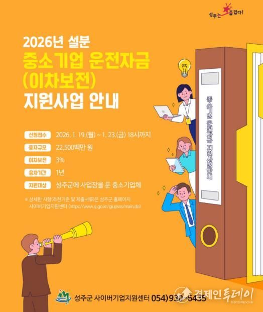 경제인투데이 류현민 기자 | 성주군은 설 명절을 앞두고 관내 중소기업의 자금 부담 완화를 위해 2026년도 중소기업 운전자금(이차보전) 설 명절분을 225억원 규모로 지원한다.