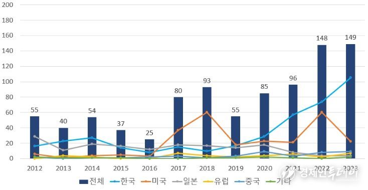 같은 기간 연평균 증가율도 한국이 18.7%로 가장 높았고, 그 다음은 중국(14.7%)과 미국(12.5%)이었으며, 유럽연합(5.8%)과 일본(-19.8%)은 주요국의 연평균 증가율 9.5%보다 매우 낮거나 감소세를 보였다.