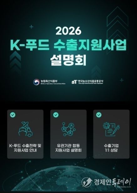 경제인투데이 류현민 기자 | 농림축산식품부는 K-푸드의 글로벌 진출 확대를 위해 전년보다 900억원 증가한 7,070억원 규모의 2026년 K-푸드 수출지원사업 설명회를 1월 23일 서울 과학기술컨벤션센터에서 개최한다고 밝혔다.
