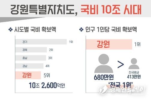 경제인투데이 류현민 기자 | 강원특별자치도는 국비 확보 10조 시대에 진입한 가운데, 인구 1인당 국비 확보액이 약 680만 원으로 전국 1위에 해당한다고 밝혔다.