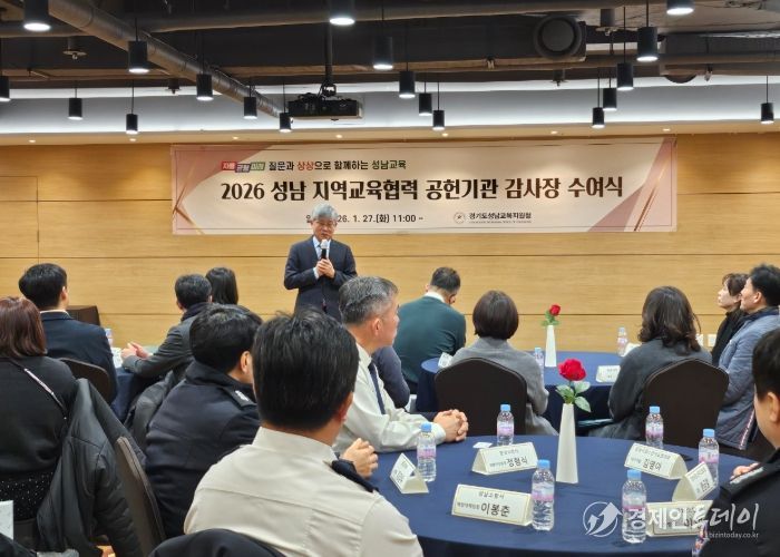경제인투데이 류현민 기자 | 경기도성남교육지원청은 1월 27일 스카이파크 호텔에서 '성남 지역교육협력 공헌기관 감사장 수여식'을 개최하여 성남교육 발전을 위해 협력해 온 지역교육협력기관 22곳에 감사의 뜻을 전했다.