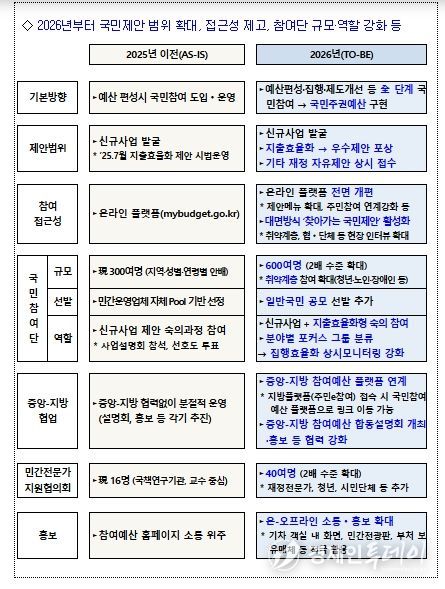 이에 기획예산처는 그 첫 발걸음으로 2018년에 도입된 국민참여 예산제도를 획기적으로 확대·개편하고 2026년을 참여예산제도 도입 제2의 원년으로 삼고자 한다.