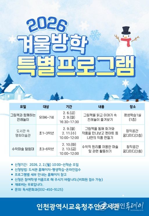 경제인투데이 류현민 기자 | 인천광역시교육청주안도서관은 관내 유·초등학생에게 다양한 평생학습 기회를 제공하기 위해 2월 6일부터 13일까지 ‘겨울방학 특별프로그램’을 운영한다.