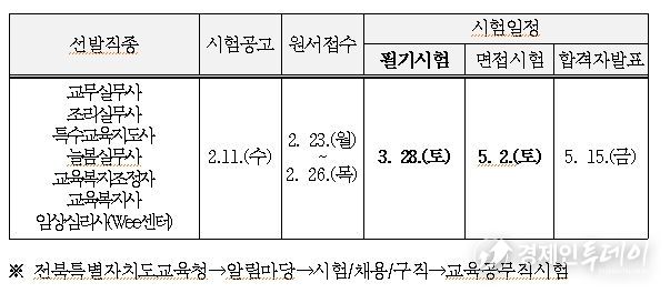 경제인투데이 류현민 기자 | 전북특별자치도교육청은 교육공무직원 채용시험을 준비하는 응시자의 편의를 위해 2026년 교육공무직원 채용시험 일정을 4일 누리집을 통해 사전 안내했다.