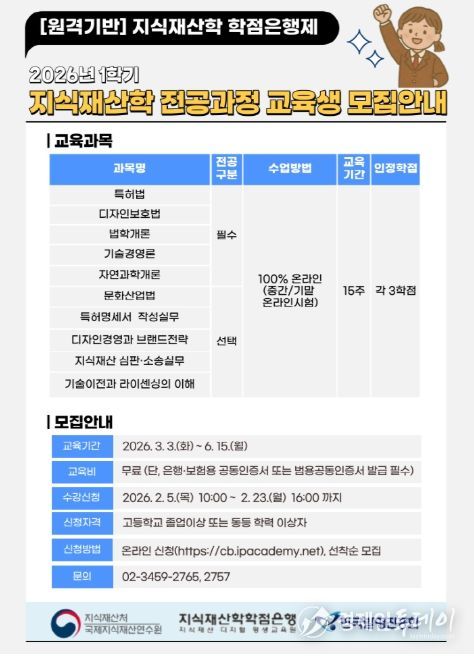 경제인투데이 류현민 기자 | 지식재산처 국제지식재산연수원은 한국발명진흥회와 공동으로 2월 5일부터 23일까지 지식재산학 학점은행 과정에 대한 온라인 수강생을 모집한다.