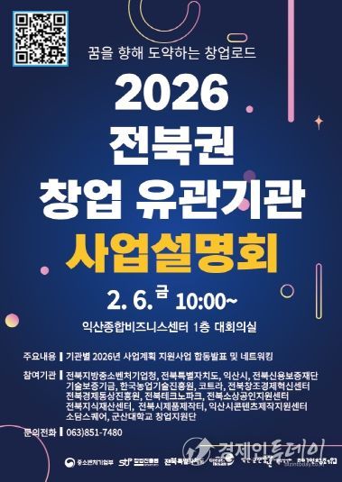 도는 6일 익산시 중장년 기술창업센터에서 중장년 예비 창업자와 초기 창업기업을 대상으로 전북창조경제혁신센터, 전북테크노파크, 기술보증기금 등 지역 내 10여 개 창업 유관기관과 함께 ‘2026년 창업 유관기관 사업설명회’를 개최했다고 밝혔다.