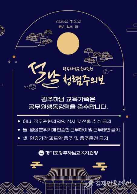 경제인투데이 류현민 기자 | 경기도광주하남교육지원청은 2월 9일, 2026년 병오년 설명절을 맞아 관내 교직원들이 청렴한 마음가짐으로 새해를 시작할 수 있도록‘교육장 청렴서한문’과‘청렴주의보’를 각급 학교에 전달했다.