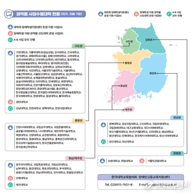장애인고등교육지원센터는 2025년 ‘대학의 장애학생지원센터 운영지원 사업’을 통해 98개 대학에 교육지원인력과 보조공학기기 등을 지원하고, ‘장애학생 지원 권역별 선도대학 운영 사업’을 통해 10개 대학을 지정하여 진로탐색부터 취업까지 지원한 바 있다. 또한, 대학 현장의 전문성을 강화하기 위해 대학 담당자 직무교육·자문(컨설팅)과 ‘대학의 장애학생 지원 매뉴얼’ 수정·배포도 추진했다.
