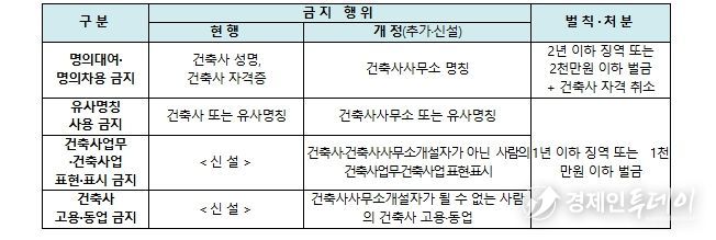 이에 따라, 건축사사무소 명의대여 등에 대한 금지 규정을 마련하고 위반 시 처벌할 수 있는 근거를 신설했다.