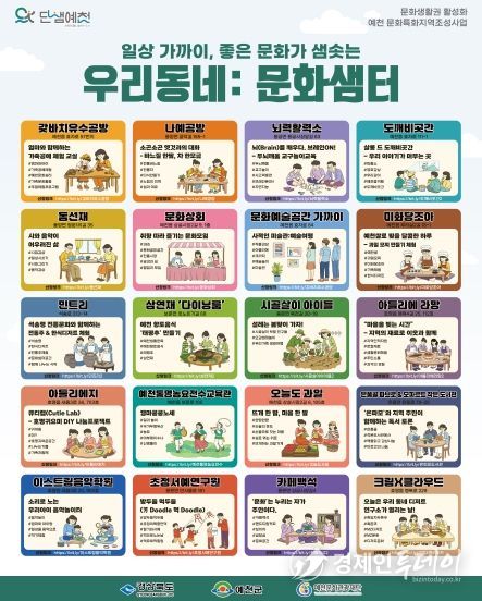 경제인투데이 류현민 기자 | (재)예천문화관광재단은 ‘문화특화지역 조성사업’의 일환으로 추진 중인 ‘우리동네 문화샘터’의 공간별로 세부 프로그램 공개, 오는 28일까지 참여자를 모집한다.