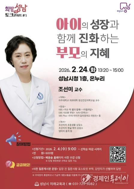 경제인투데이 류현민 기자 | 성남시는 올해 첫 ‘희망성남 토크콘서트’ 강연자로 부모 교육 전문가로 평가받는 조선미 아주대학교 의과대학 정신건강의학 교실 교수를 초빙한다.