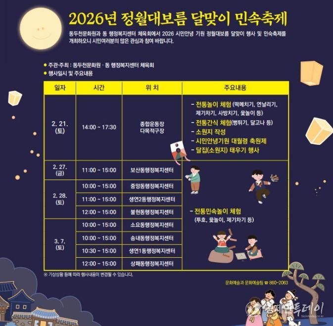 경제인투데이 류현민 기자 | 동두천시는 2026년 정월대보름(양력 3월 3일)을 맞아 동두천문화원과 각 동 체육회에서 2026년 정월대보름 달맞이 전통 민속행사를 개최한다고 밝혔다.