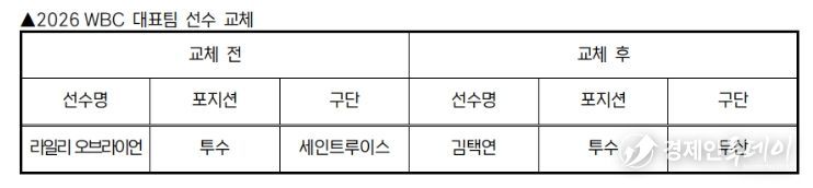 경제인투데이 류현민 기자 | KBO 전력강화위원회는 부상으로 인해 WBC 참가가 어려워진 세인트루이스 라일리 오브라이언을 대체할 선수로 두산 김택연을 확정하고 WBC 조직위에 선수 교체 승인을 요청했다.