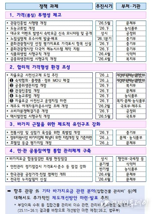 정부는 이번 대책에 따른 제도개선을 위해 관련 법령개정 등 후속조치를 신속히 추진할 예정이다. 또한, 주요 과제들이 현장에 빠르게 안착되어 바가지요금이 근절될 수 있도록 지방정부 및 유관 협・단체와 긴밀히 협조하는 한편, 대책의 주요 내용들을 국민과 업계에 신속히 알리고 과제 추진 상황을 면밀히 모니터링할 계획이다.