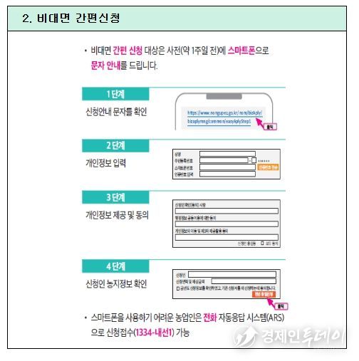금년의 경우 신청 편의성 제고를 위해 스마트폰 등을 이용한 비대면 신청기한을 1개월에서 3개월로 확대했다. 신청일 기준으로 농업경영체 등록정보가 지난해와 변동이 없는 농업인은 비대면 간편신청이 가능하며, 별도의 서류 제출 없이 스마트폰이나 전화자동응답시스템(ARS)를 이용해 신청이 가능하다. 이들에게는 문자메시지(SMS) 등을 통해 3월 3일부터 신청을 안내할 예정이다. 또한, 간편신청이 불가한 농업인·법인은 인터넷에 접속하여 비대면 신청이 가능하도록 신청방식을 추가 도입하여 농업인들이 보다 편리하게 신청할 수 있게 했다.