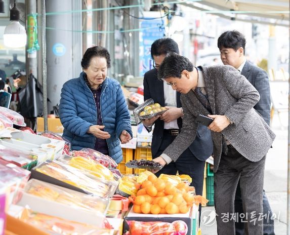 김 군수는 채소 좌판에서 배추와 시금치 가격을 묻고 과일 가게에서는 제철 과일을 직접 고르며 상인들과 대화를 나눴다. 정육점에서는 “오늘 손님이 좀 늘었느냐”고 묻자 상인은 “아침부터 상품권 결제가 이어지고 있다”며 “장날답게 손님 발길이 이어져 기대가 크다”고 답했다.