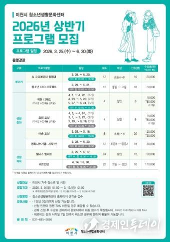 경제인투데이 류현민 기자 | 이천시 청소년생활문화센터가 청소년과 지역주민의 건강한 생활문화 형성과 역량 강화를 위해 ‘2026년 상반기 프로그램’을 운영하고 수강생을 모집한다고 밝혔다.