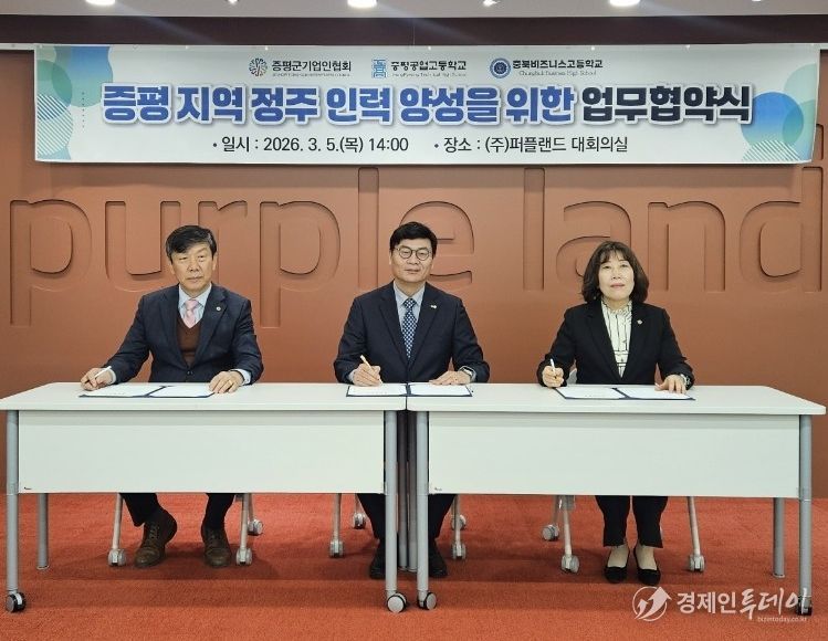 협회는 5일 퍼플랜드 회의실에서 증평공업고등학교, 충북비즈니스고등학교와 ‘지역 정주 미래 기술 인력 양성을 위한 업무협약(MOU)’을 체결했다.