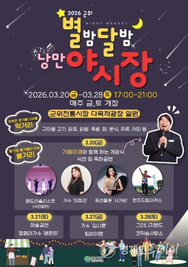 경제인투데이 류현민 기자 | 군위군은 전통시장에 활력을 불어넣고 군민과 방문객들에게 봄밤의 추억을 선사하기 위해 '군위전통시장 별밤달밤 낭만 야시장'을 오는 3월 20일 개장해 3월 28일까지 매주 금요일과 토요일 운영한다고 밝혔다.