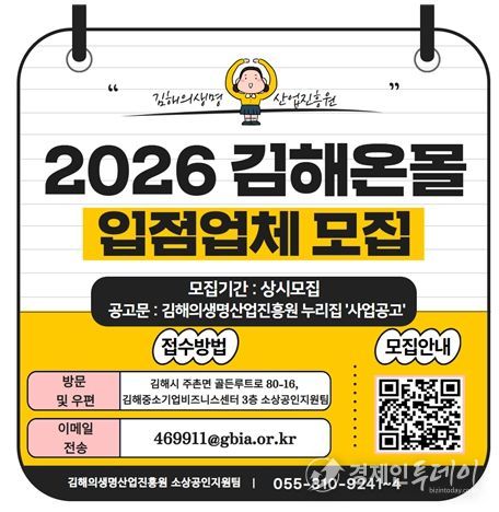 경제인투데이 류현민 기자 | 김해의생명·산업진흥원에서는 김해시 통합 온라인 쇼핑몰인 ‘김해온몰’의 입점업체 모집을 실시한다.