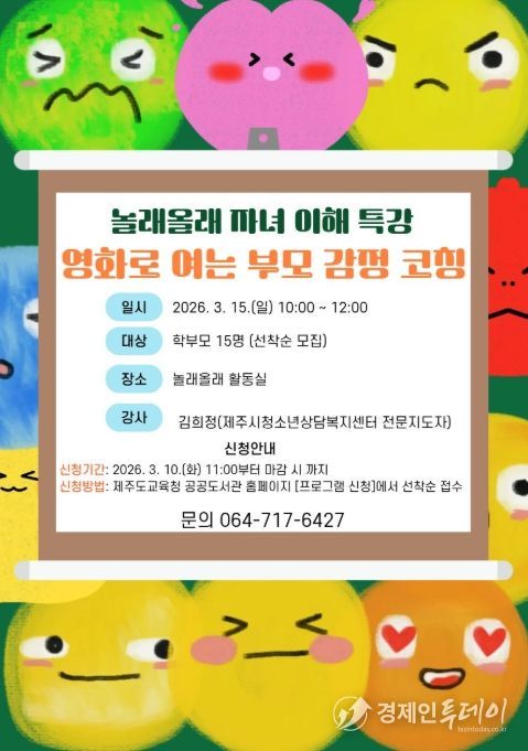 경제인투데이 류현민 기자 | 제주도교육청 제주도서관은 15일 보호자를 대상으로 자녀와의 건강한 소통을 돕기 위한 ‘놀래올래 자녀 이해 특강 : 영화로 여는 부모 감정 코칭’을 운영한다.