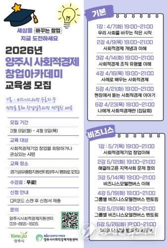 모집 인원은 기본과정 40명, 비즈니스 과정 30명으로 선착순 모집으로 수강료는 무료이며, 참여 희망 시 양주시사회적경제지원센터 누리집 공지 사항을 참고해 신청 링크 또는 큐알(QR)코드를 통해 신청할 수 있다.