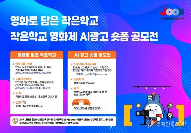 전라남도교육청은 작은학교 교육경쟁력을 높이고 학생들의 창의적 표현 역량을 키우기 위해 글로컬 작은학교 영화 특성화 교육을 추진하고 ‘영화로 담은 작은학교’ 사업과 ‘작은학교 영화제 AI 광고 숏폼 공모전’을 운영한다고 밝혔다.
