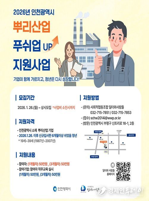 경제인투데이 류현민 기자 | 인천광역시는 뿌리산업의 고용 안정성을 강화하고 청년의 노동시장 진입을 지원하기 위해‘멘토멘티 백일업(UP) 지원사업’과 ‘뿌리산업 푸쉬업(UP) 지원사업’을 추진한다.
