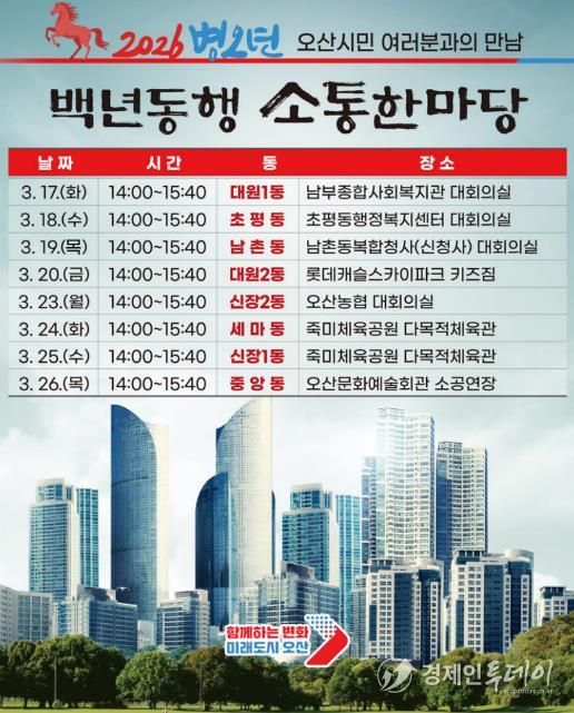 경제인투데이 류현민 기자 | 오산시가 시민과 직접 만나 시정 운영 방향을 공유하고 지역 현안을 듣는 ‘2026 백년동행 소통한마당’을 개최한다.