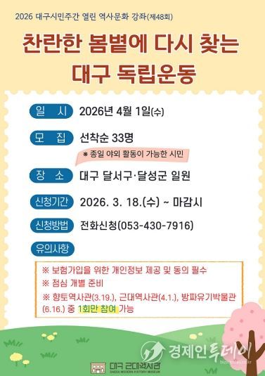 경제인투데이 류현민 기자 | (재)대구문화예술진흥원 박물관운영본부 소속 대구근대역사관은 2026 대구시민주간 연계행사로 4월 1일 대구시 달서구와 달성군 일원의 대구 독립운동가와 문화유산을 찾아보는 ‘찬란한 봄볕에 다시 찾는 대구 독립운동’ 답사를 개최하며, 참가자를 모집한다.