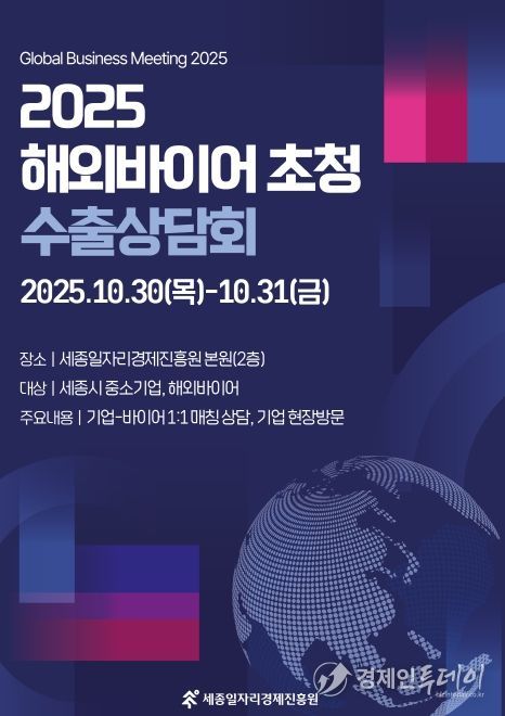 경제인투데이 류현민 기자 | 세종일자리경제진흥원은 오는 30일부터 31일까지 이틀간 진흥원 본원에서 ‘2025 해외바이어 초청 수출상담회’를 개최한다고 밝혔다.