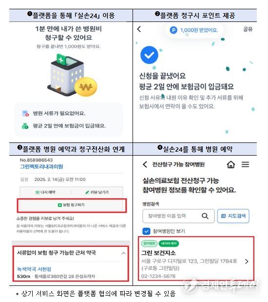 국민 대다수가 이용하는 온라인 플랫폼(네이버, 토스 등)을 이용하여 청구전산화 서비스를 쉽게 이용할 수 있게 하는 데도 노력을 기울일 계획이다. 전산개발을 거쳐 빠르면 ’25.11월부터 ➊플랫폼 앱을 통해 「실손24」 서비스를 동일하게 이용 가능하며, 실손24 앱 설치 없이도 가입 보험사 조회부터 보험금 청구까지 플랫폼 내에서 모든 과정을 진행할 수 있게 된다. ➋플랫폼을 통한 「실손24」 청구건에 대하여는 소비자에게 별도로 포인트 캐시백을 제공*할 예정이다. ➌또한, 향후 플랫폼이 제공하고 있는 고유 서비스(예: 병원 예약)와도 연계하여 병원 예약부터 보험금 청구까지 One-stop으로 진행할 수 있도록 서비스를 보다 편리하게 개선할 계획이다. ➍한편, 「실손24」를 통해서도 플랫폼(예: 네이버)의 병원 예약 서비스를 이용할 수 있는 상호간 서비스 연계는 이미 활용할 수 있다.