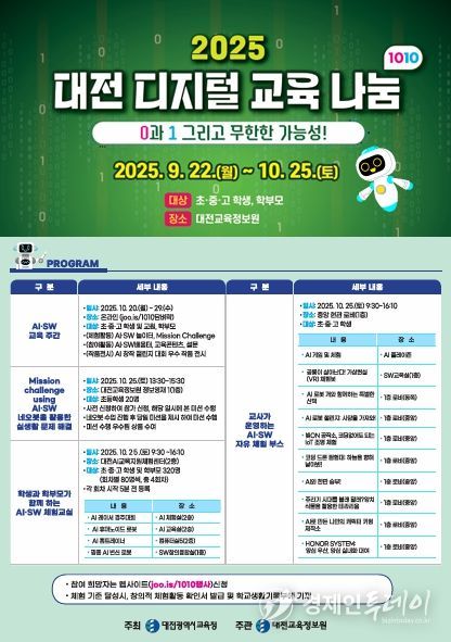 경제인투데이 류현민 기자 | 대전교육정보원은 ‘0과 1 그리고 무한한 가능성’을 주제로 ‘2025년 대전 디지털 교육 나눔1010’ 행사를 9월 22일부터 10월 28일까지 5주간 초·중·고 학생, 교원, 학부모를 대상으로 다채로운 온·오프라인 프로그램을 기획하여 성황리에 운영했다고 밝혔다.
