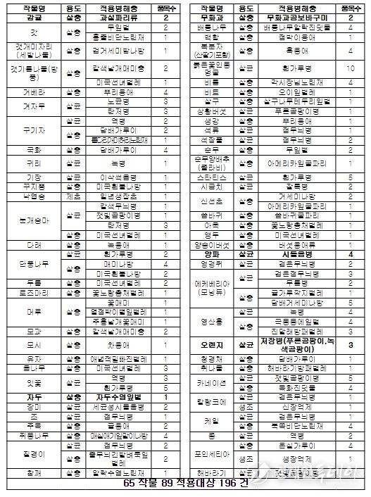 이와 함께 섞어짓기(혼작), 사이짓기(간작) 등 영농조건에 따라 작물별로 다른 농약을 사용해야 하는 현장의 어려움을 반영해 여러 작물에 사용할 수 있는 범용 농약도 2019년 40품목에서 올해 81품목으로 확대 등록했다.