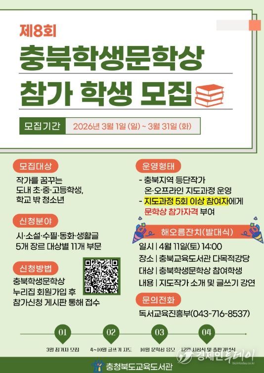 경제인투데이 류현민 기자 | 충청북도교육청 직속기관 교육도서관은 작가를 꿈꾸는 청소년들의 문학 창작 활동을 지원하기 위해 '제8회 충북학생문학상' 참가자를 모집한다고 밝혔다.