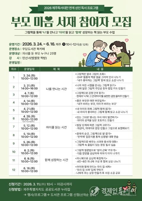 경제인투데이 류현민 기자 | 제주시 우당도서관은 부모의 독서 역량을 강화하고 자녀와의 정서적 유대감을 높이기 위한 그림책 소통 프로그램 ‘부모 마음 서재’ 참여자를 모집한다.