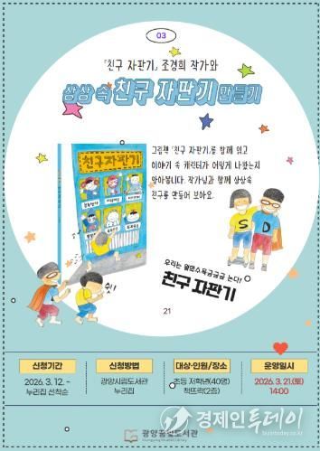참가 신청은 3월 12일 오전 10시부터 광양시립도서관 누리집에서 선착순으로 접수하며, 광양시에 거주하는 초등학생 40명을 대상으로 한다.
