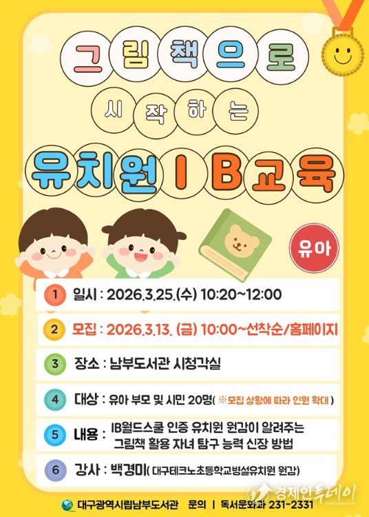 경제인투데이 류현민 기자 | 대구시교육청 산하 남부도서관은 오는 3월 25일 유치원 학부모의 국제바칼로레아(IB) 교육에 대한 이해를 높이고, 가정에서 그림책을 활용한 탐구 활동을 실천할 수 있도록'그림책으로 시작하는 유치원 국제바칼로레아(IB) 교육' 특강을 운영한다.