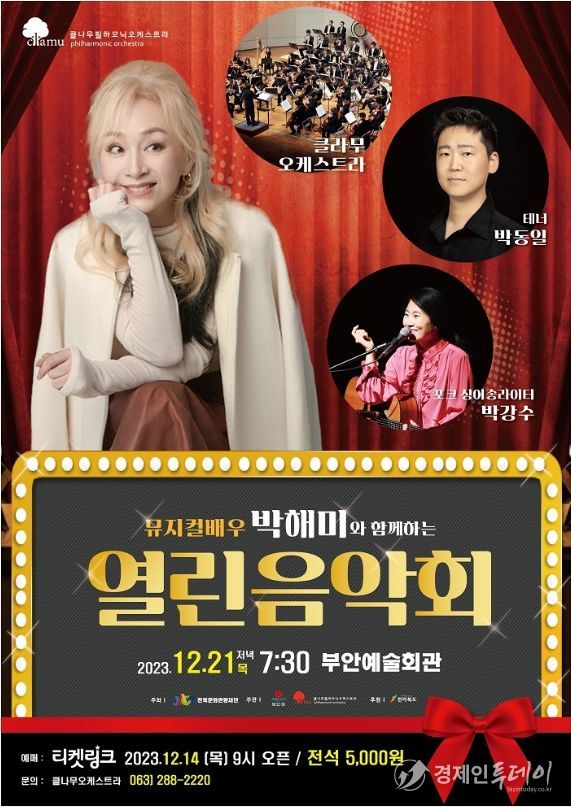 경제인투데이 유종운 기자 | 부안예술회관은 따뜻한 음악 선물이 있는 연말 힐링 콘서트 ‘박해미와 함께하는 열린음악회’ 공연을 오는 12월 21일(목) 19시 30분에 부안예술회관 공연장에서 개최한다.