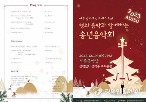 한편, 여주필하모닉 오케스트라와 함께하는 ‘영화 음악과 함께하는 송년음악회’는 오는 12월 19일 오후 7시 세종국악당에서 개최되며, 초대권 및 입장권이 없이 누구나 무료로 입장·관람할 수 있다.