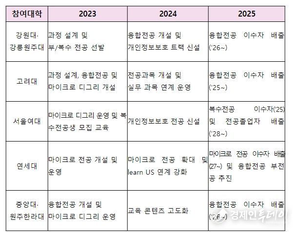 지난 ’22년 서울여대가 선정되어 2년째 운영 중이며, 올해에 △강원대(강릉원주대), △고려대, △연세대, △중앙대(원주한라대) 등 4개 대학을 추가로 선정하여, 개인정보 전공 개설 및 교육과정 개발·운영 등을 추진하고 있다.