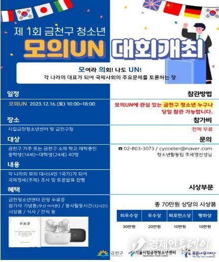 경제인투데이 유종운 기자 | 금천구는 12월 16일 13시 구청 대강당에서 ‘금천구 청소년 모의 국제연합(UN)’을 개최한다고 밝혔다.