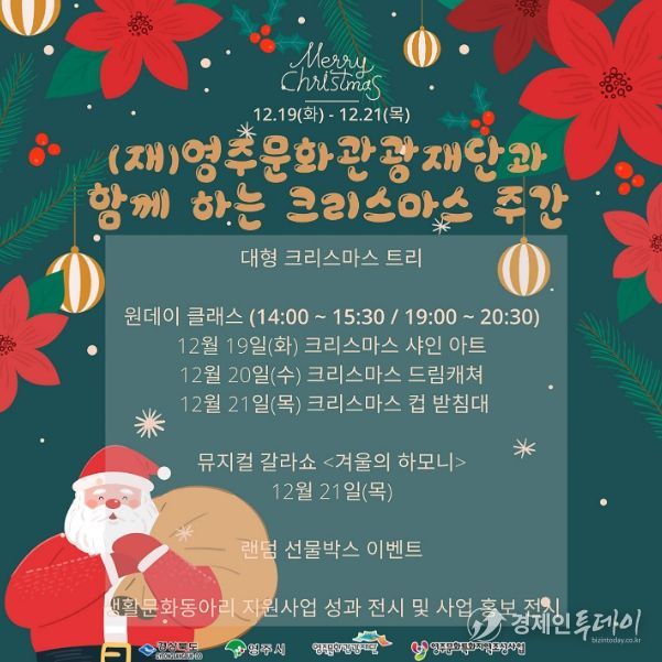 경제인투데이 유종운 기자 | (재)영주문화관광재단은 크리스마스와 연말연시를 맞아 오는 19일부터 21일까지 148아트스퀘어에서 가족이 함께 즐길 수 있는 다양한 크리스마스 행사를 개최한다.